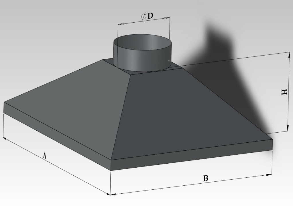 Вытяжной зонт изготавливается из металла. Конструктивно он представляет собой открытый снизу короб, подсоединенный к вытяжному воздуховоду. Такие зонты могут работать и при естественной, и при принудительной вентиляции.